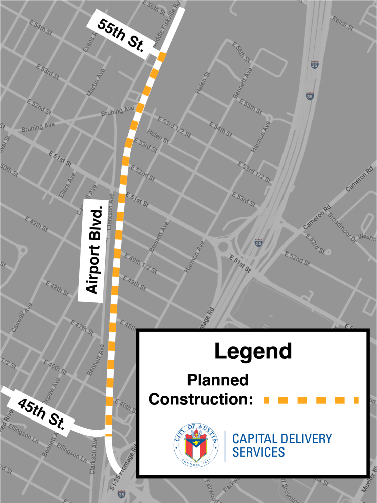 Currently: Work in progress northward along Airport Blvd. extending from Middle Fiskville Rd/55th St and progressing southward along the western side of Airport Blvd to 45th St.