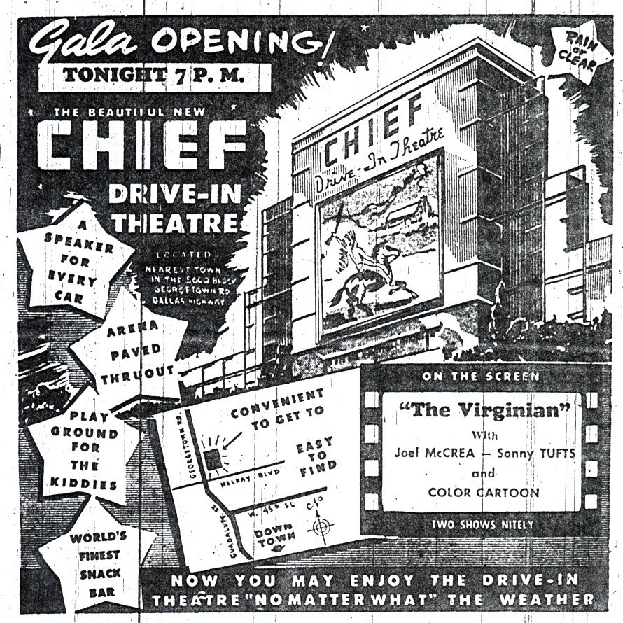 The Chief Drive-In advertised Color Movies in All Weather. The “Gala” opening of the theater featured a showing of “The Virginian,” which was released in 1946, along with a “color cartoon!” In later years, a small train circled the drive-in, and children could take the train to the playground.