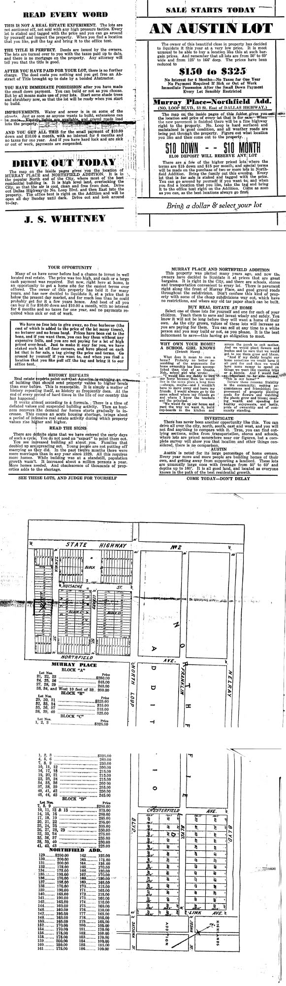 Developers like J.S. Whitney placed flyers like this on car windshields to encourage people to come out and put “one dollar down” on a lot east of Dallas Highway (now Lamar).